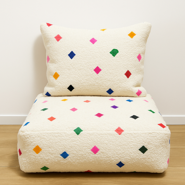 Ce pouf marocain mesurant 60X60X25cm est une pièce unique, élégante et moderne qui marie le design traditionnel berbère à un style contemporain. Il est fabriqué à partir de tapis Azilal 100% laine, seul le dessous est en coton. La laine est douce et de couleur écrue, orné de motifs losanges multicolores, disposés de manière régulière. Les losanges sont réalisés dans des teintes vives telles que le rose, le bleu, l'orange, le vert et le rouge, ce qui apporte une touche de gaieté et de dynamisme à l'ensemble.